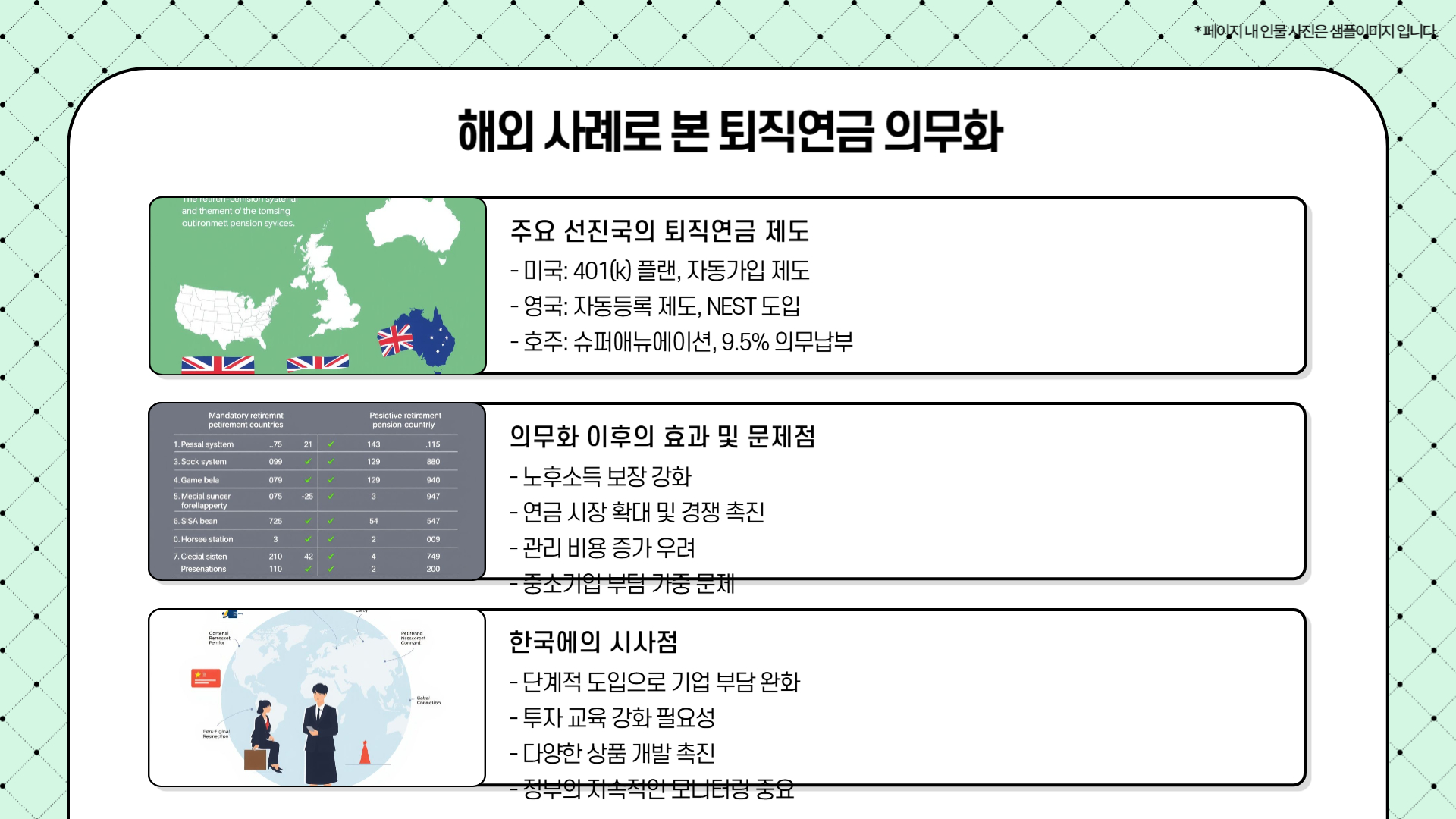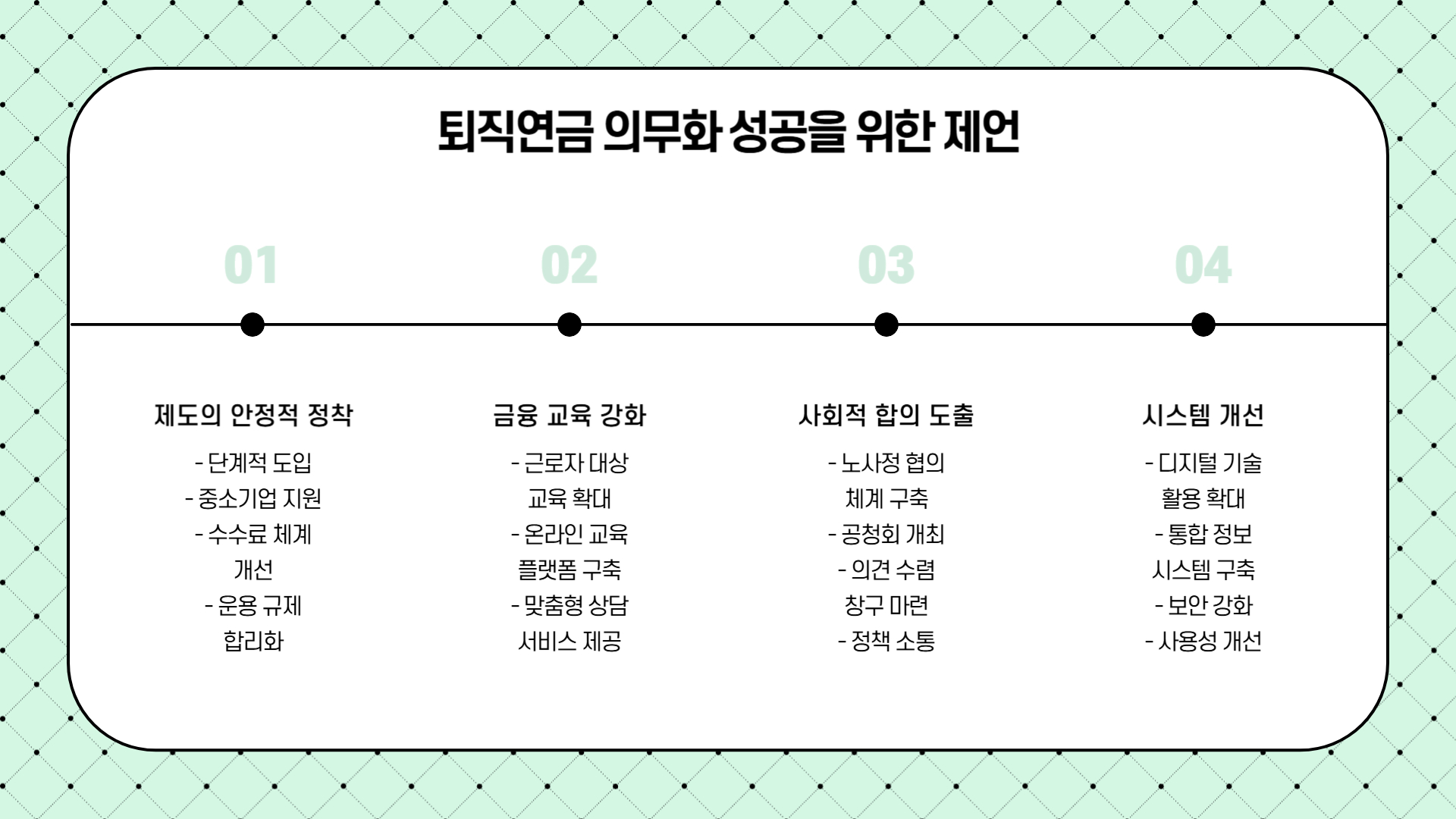| 가입 대상 | 일부 기업 퇴직연금, 나머지는 퇴직금 | 대부분 기업 퇴직연금 가입 의무화 |