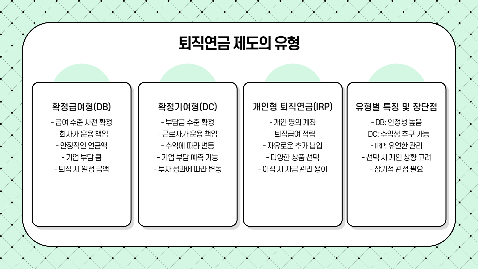 - 퇴직금: 회사가 퇴직 시점에 근로자에게 직접 지급하는 방식.