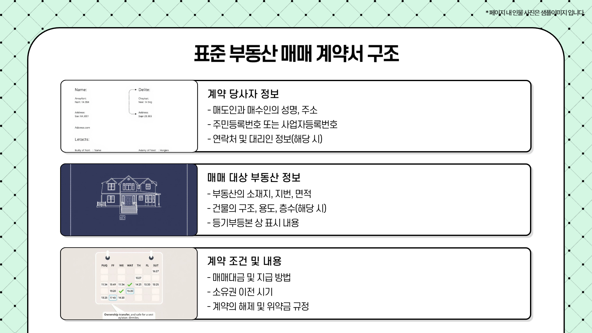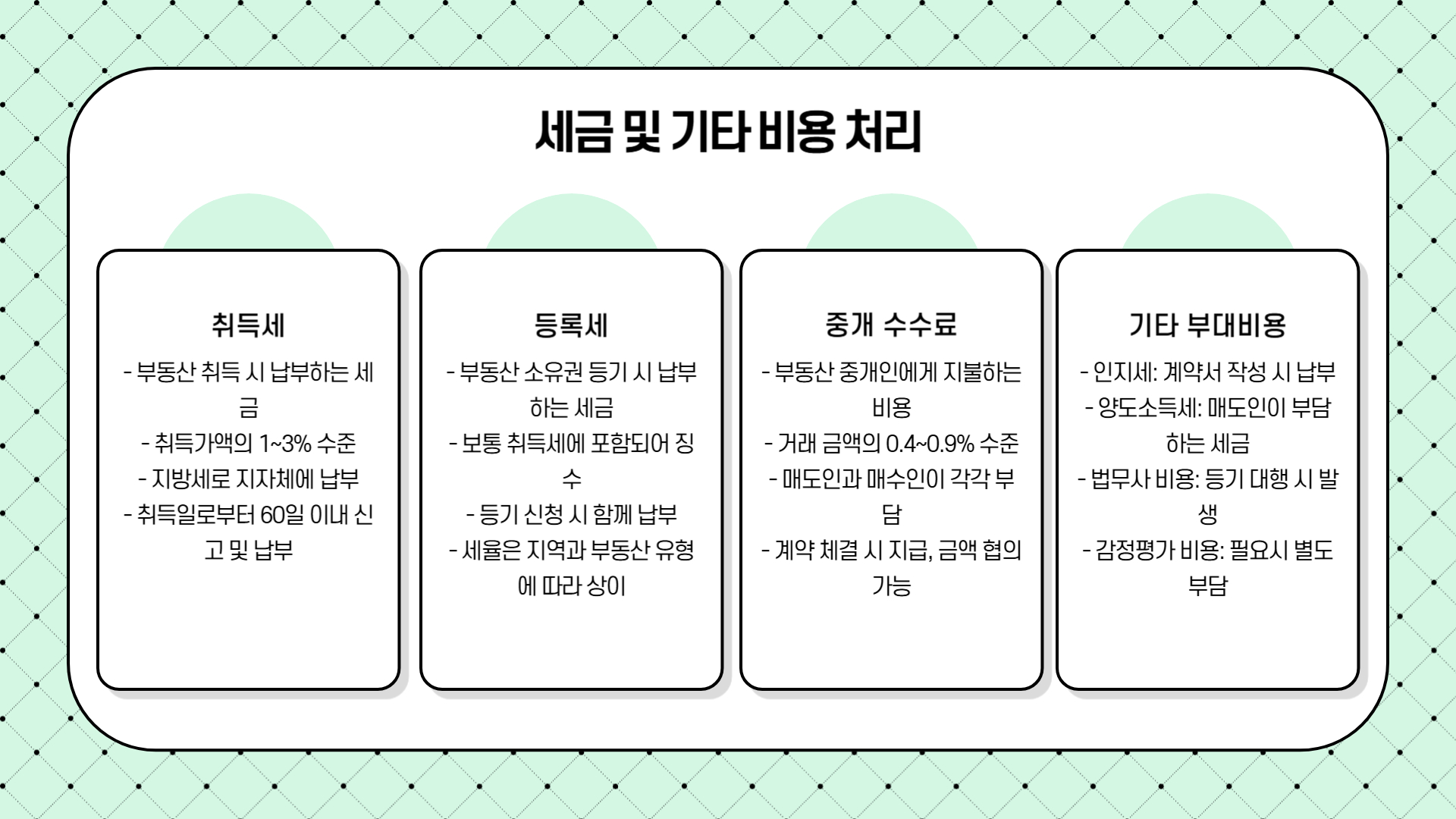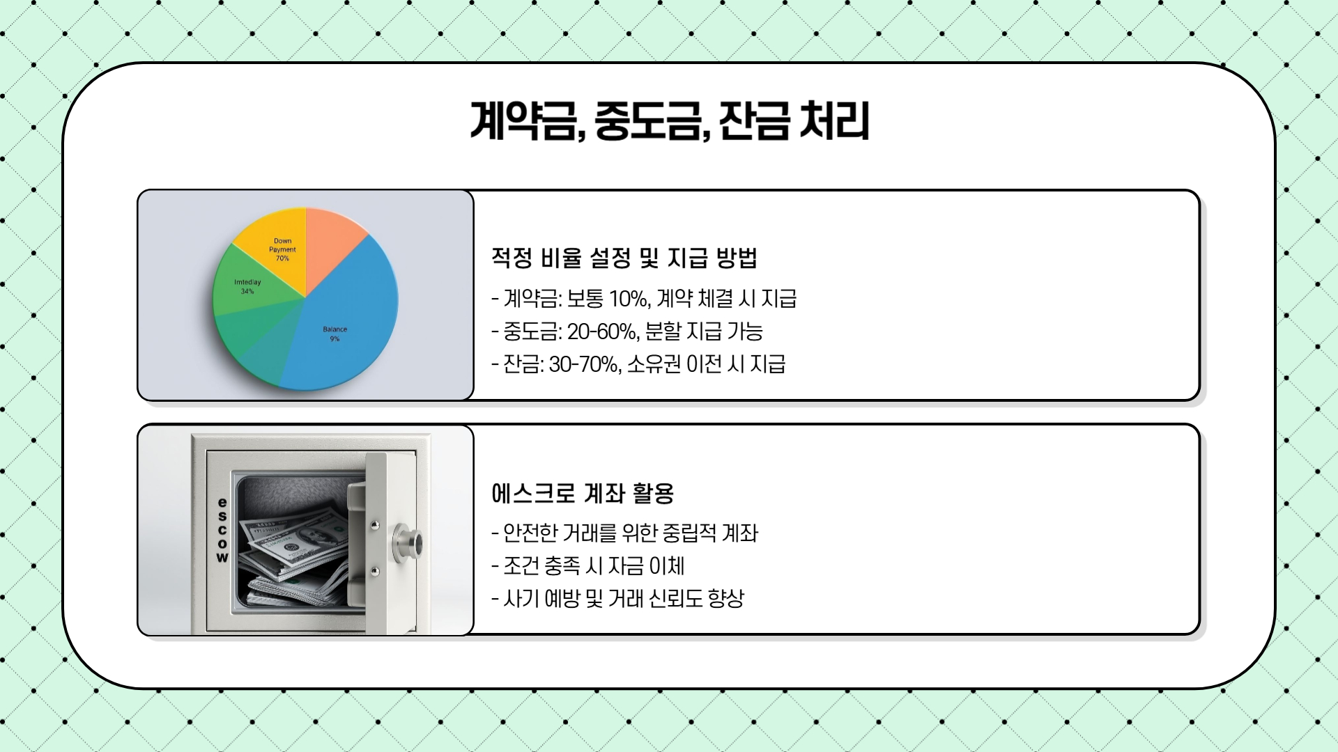 | 3단계 | 계약서 작성 및 계약금 지급 | 매도인 본인 확인, 계약서 내용 꼼꼼히 확인, 특약사항 기재 |