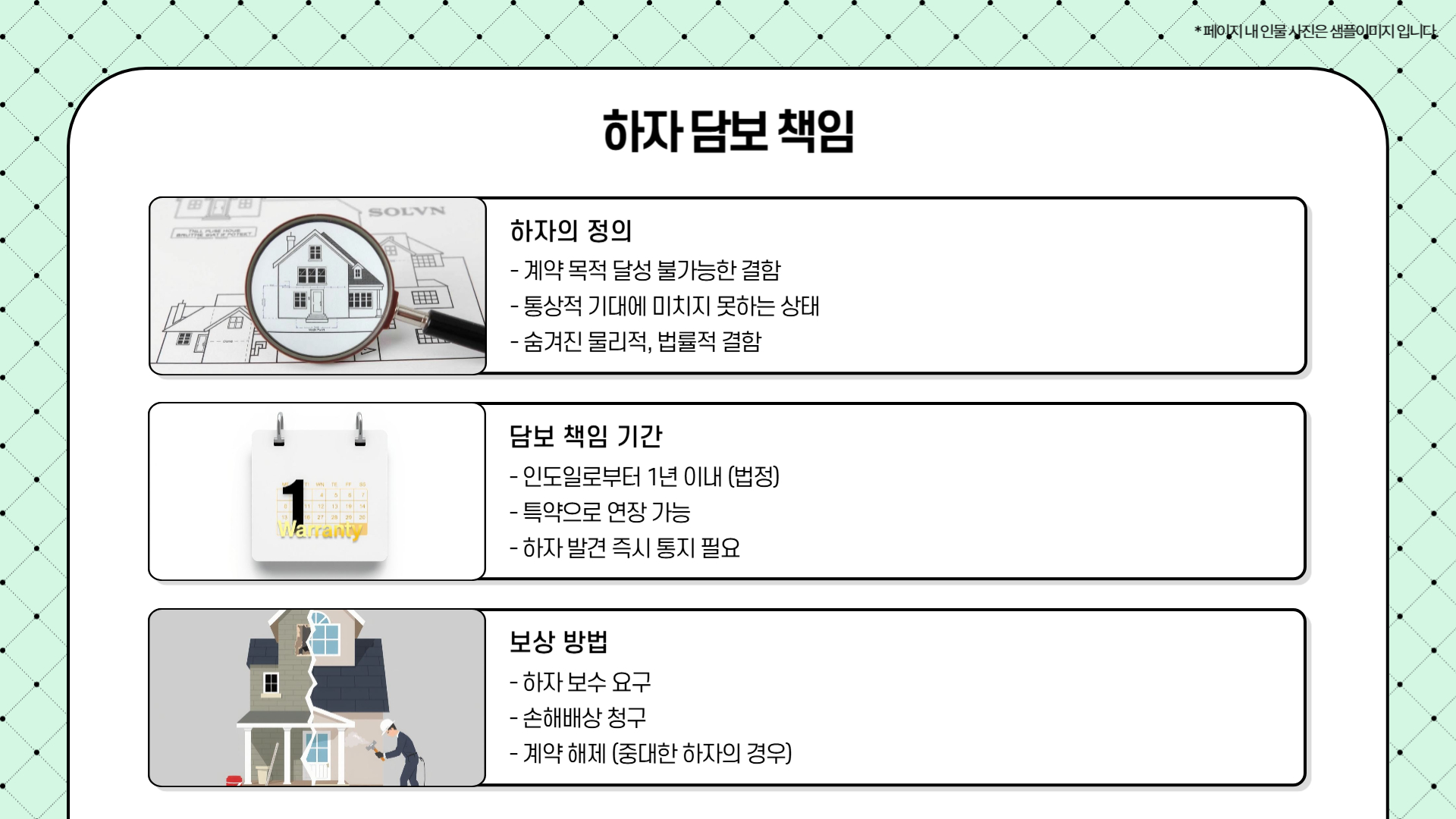 - 숨은 하자 확인 부족: 육안으로 확인 어려운 누수, 결로, 곰팡이, 난방/수도 문제 등은 잔금 전 다시 한번 확인하거나, 특약으로 하자 담보 책임을 명시하는 것도 좋은 방법이에요.