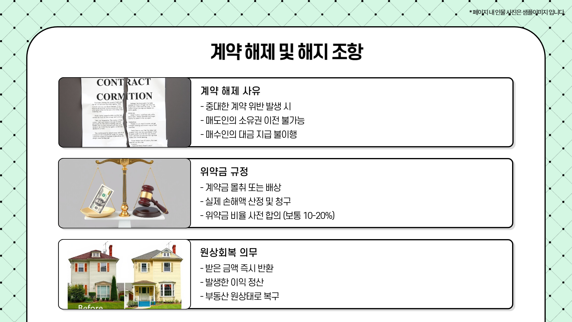 - 제5조 (계약의 해제): 계약금 포기나 배액 상환을 통한 계약 해제 조항이에요. 계약이 틀어질 경우 어떻게 되는지가 명시되어 있으니 꼭 알아두세요.